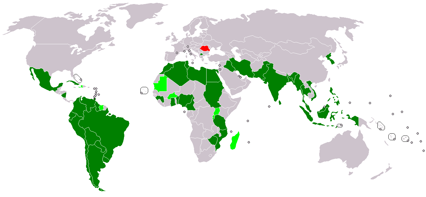 Sistema mundial de preferencias comerciales entre países en desarrollo. Miembros: verde oscuro - Solicitantes: verde claro - Antiguos miembros: rojo. Wikimedia commons