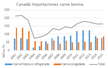 En 2015, Canadá importó unas 162 mil toneladas entre carne fresca y refrigerada y carne congelada, siendo abastecido principalmente por EE.UU., Australia, Nueva Zelanda y Uruguay. Como se ve en el gráfico que sigue, las carnes congeladas han recuperado participación, en tanto las refrigeradas han caído en los últimos años.