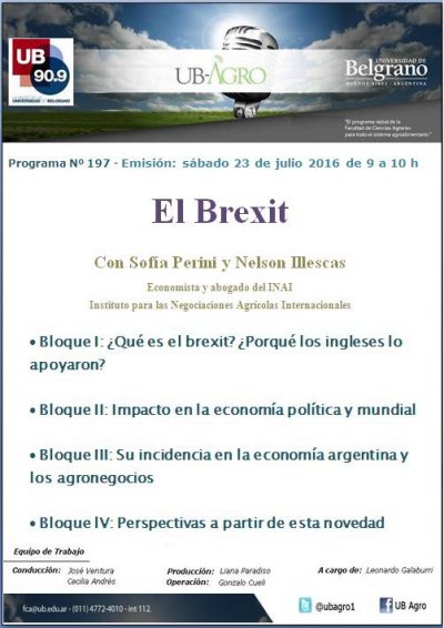 El Abog. Nelson Illescas y la Lic. Sofía C. Perini participaron del programa de radio UB Agro, donde se conversó sobre la posible salida del Reino Unido de la Unión Europea y sus consecuencias.