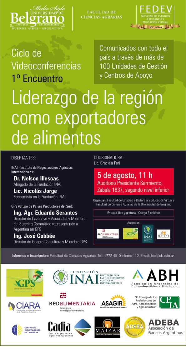 La Fundación INAI participó de la 1ra. videoconferencia “Liderazgo de la región como exportadores de alimentos” en la Universidad de Belgrano. En ese marco el Abog. Nelson Illescas y el Lic. Nicolás Jorge hicieron una presentación sobre el nuevo regionalismo y sus consecuencias para el comercio agroindustrial del Mercosur.