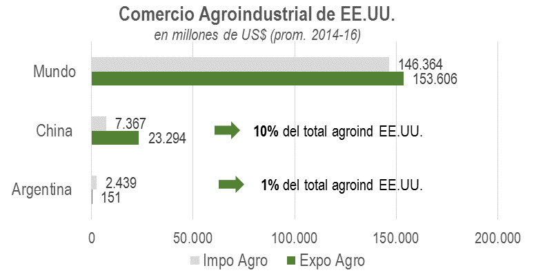 En el caso del comercio agroindustrial, se invierte el sentido de la balanza, como se puede observar en el gráfico. EE.UU. tiene un saldo agroindustrial positivo de alrededor de 15 mil millones de dólares. China recibe el 15% de sus exportaciones agrícolas, por un valor de 23.294 millones de dólares. Los principales productos exportados a China por EE.UU. que representan el 75% del total agroindustrial son: porotos de soja (56%), sorgo (7%), heces y desperdicios de cervecería o destilería (5%), cueros y pieles (4%), algodón (4%).