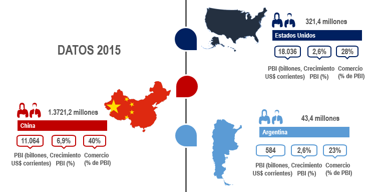 Cabe destacar, que China es el principal proveedor de los EE.UU. representando un quinto (21%) de sus importaciones totales, por un valor de 490.680 millones de dólares (en promedio 2014-16), y el tercer destino de sus exportaciones, recibiendo 14% del total por 118.507 millones de dólares. Esto muestra la magnitud de esa balanza comercial negativa (de alrededor de 372 mil millones de dólares), que tanto preocupa a los estadounidenses.